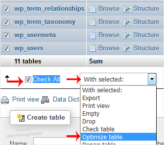 4. Role para baixo e marque Verificar tudo . Clique na opção suspensa e selecione Otimizar tabelas .